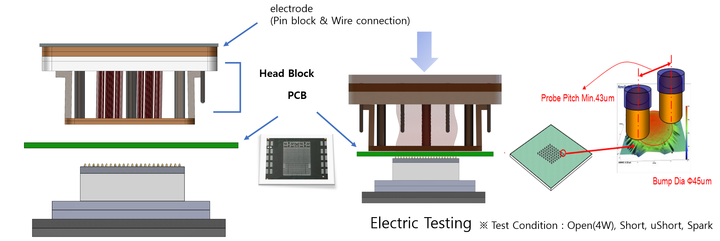PCB는 각종 전자제품에 사용되는 반도체 칩이 실장되어 메인보드와 전기적 신호를 주고 받을 수 있는 매개체 역할을 하며, PCB Test Fixture는 해당 PCB가 정상적인 기능 수행이 가능한지 양품 선별을 진행하는 BBT(Bare Board Test) 공정에서 사용 됩니다. 당사는 20년이 넘는 기간 동안 PCB BBT 공정 경험을 바탕으로, 다양한 타입의 PCB를 테스트 할 수 있는 고품질의 Fixture를 생산 중이며 많은 고객사로부터 기술을 인정받고 있습니다. Wire Probe Type은 BGA PCB의 BBT 회로검사용 지그로 사용되며, Wire Probe와 Pogo Pin을 적용합니다. PIN 설정은 2W 방식과 MICRO OPEN 검사가 가능한 2+4W 방식으로 설계하여 제작합니다.
